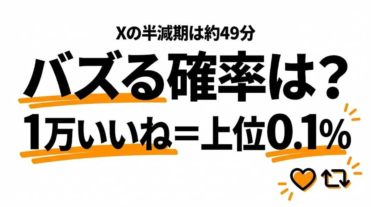 バズの目安は 1万いいね以上 (Xの場合、上位0.1%)。TikTokは フォロワー0でもバズ可能 、Xの投稿半減期は 約49分 。ゴールデンタイムは 平日20〜22時 。バズりやすいのは 共感・有益・意外性 のある投稿です。